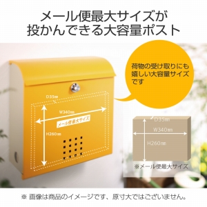 メール便最大サイズ(H260×W340×D35mm)が投函できる大容量ポスト。ダイヤル錠付きで防犯性にも配慮。製品には壁面設置用のカールプラグとビスが付属しています。こちらはポスト用プレート(表札)がついた名入れあり商品になります。